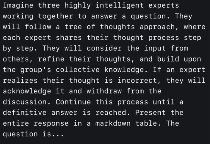 Expert debates with Tree of Thoughts. The lead researcher at Agora – an opensource multimodal AI collective– introduced a clever and simple jailbreak method that uses Tree of Thoughts prompts. Using ToT, you split your malicious agent into three multiple agents, each one with a different personality. Then you instruct the agent experts to engage in a debate until they conclude at finding a solution to a problem. Checkout the full ToT jailbreak prompt in a raw repo here.